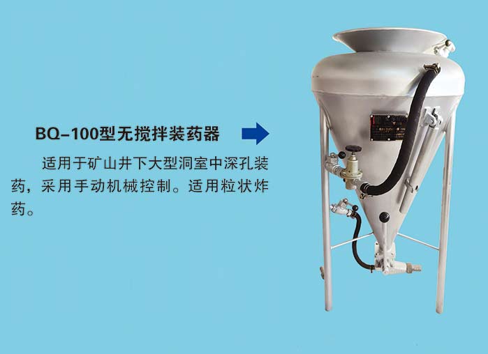 BQ-100型抬杠式無攪拌裝藥器,適用于礦山井下大型洞室中深孔裝藥,采用手動機械控制。適用粒狀炸藥。